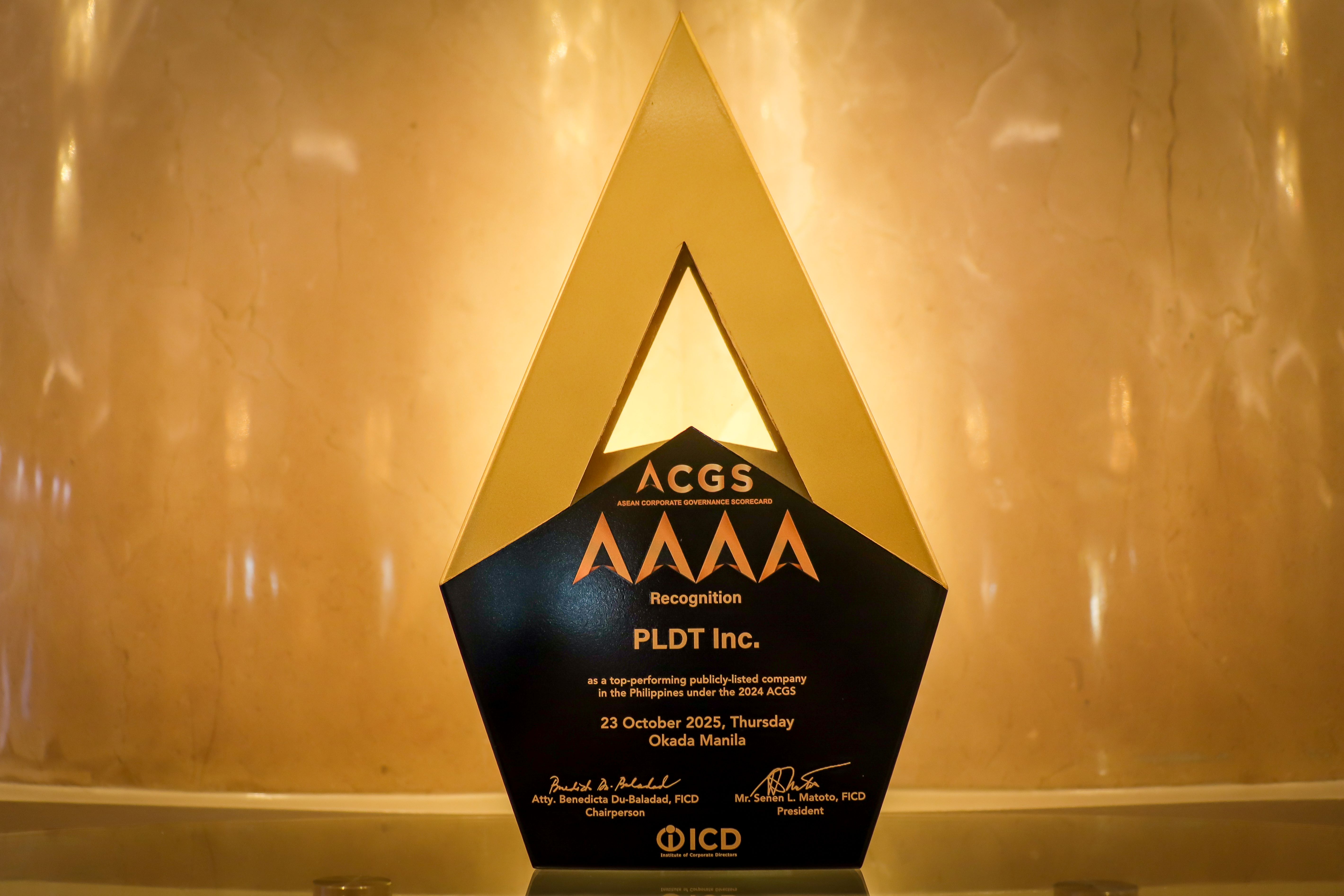 PLDT has been a consistent recipient of the prestigious Golden Arrow Awards, which reaffirms the company's standing as a model among publicly listed companies (PLCs) in the Philippines, based on the 2024 ASEAN Corporate Governance Scorecard (ACGS) evaluation results.